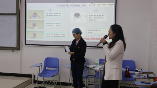 讲座中,金世玲从“新冠肺炎的概述”、“防护用品的选择与使用”、“防控要点”三个方面展开。首先,讲述了疫情防控的重要性和长期性,告诫大家一定要做好自我防护,共同营造良好的卫生环境。随后,生动科普了疫情的相关知识以及医务人员的各种防护工作内容,结合自身丰富的临床工作经验,对七步洗手法、医用防护口罩摘戴方法、个人防护用品穿脱流程这些与医务人员紧紧相关的疫情防护操作,进行了标准的讲解和规范的演示。