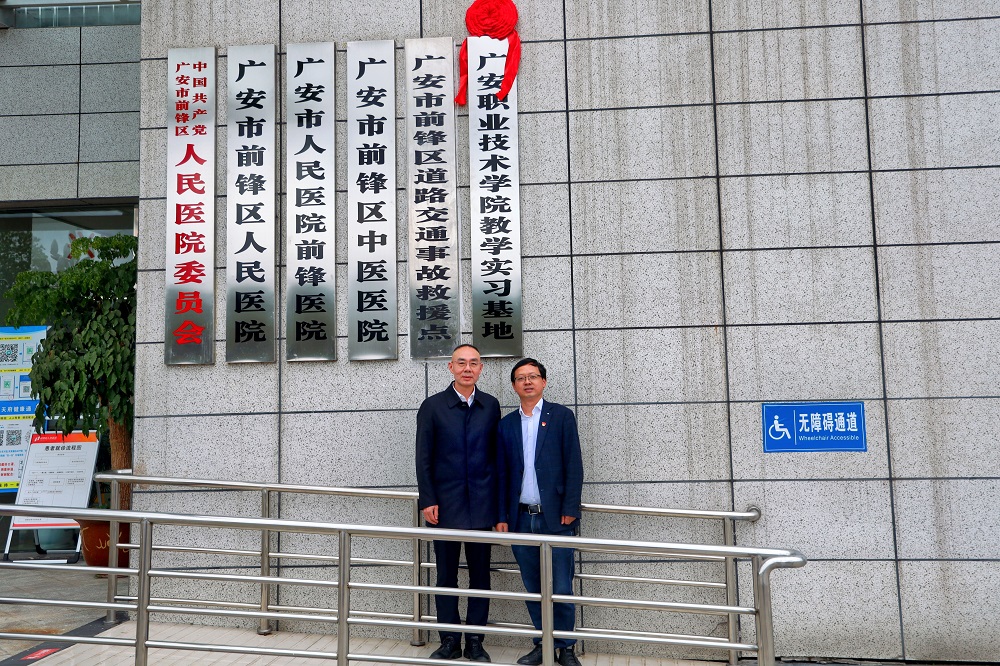 2022年4月15日下午,广安职业技术学院医学院校外教学实习基地揭牌仪式在广安市前锋区人民医院隆重举行。前锋区人民医院党委书记庹田,前锋区人民医院党委副书记、纪委书记罗常亮,医学院院长罗刚,党总支书记喻忠及相关领导和部分科室人员参加了揭牌仪式,揭牌仪式由前锋区人民医学院副院长吕大文主持。