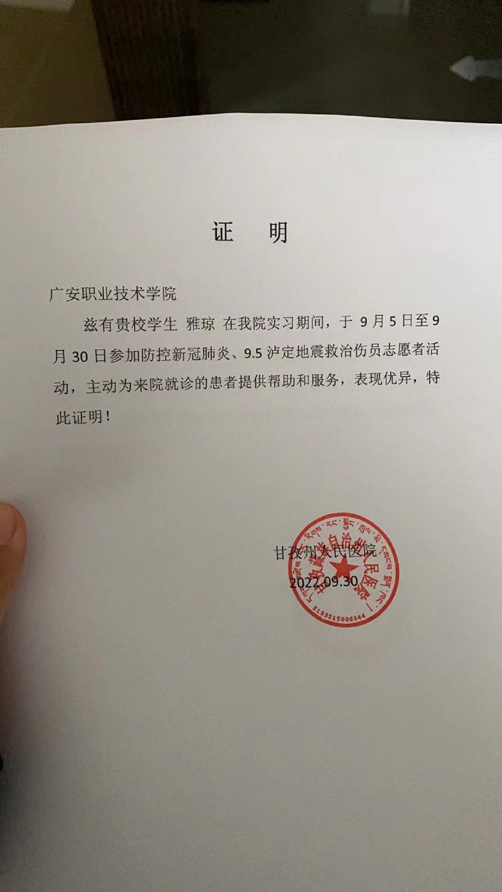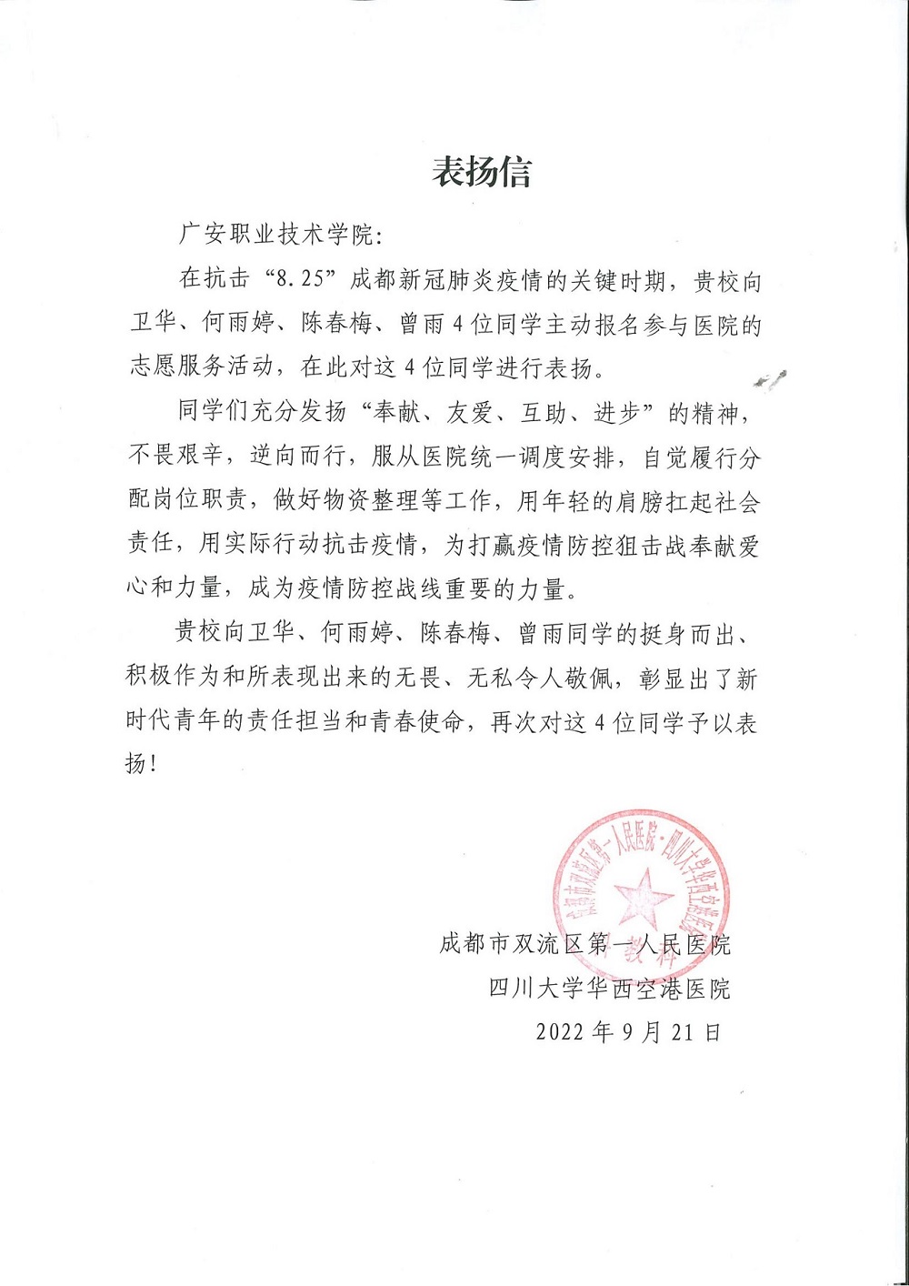 近日,医学院收到来自多家医疗单位以及共青团泸县委员会的感谢信,对医学院20康复治疗技术01班闵自强、20康复治疗技术03班董思雨、20助产02班曾雨、20护理11班陈春梅、何雨婷、向卫华、20护理15班雅琼、21护理05班尹婷同学疫情期间,以高度的热情和激情,积极投身疫情防控工作的志愿服务精神给予了充分肯定。
