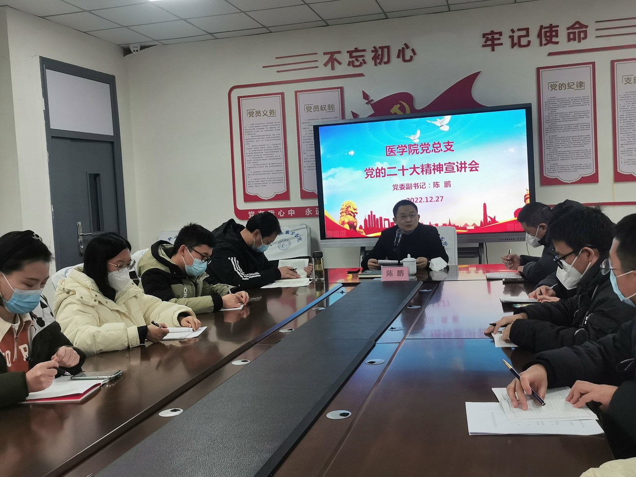 12月27日下午,学校党委副书记陈鹏到医学院党总支宣讲党的二十大精神。宣讲会在奎阁校区明辉楼118会议室举行,医学院班子成员、医学院党总支教师支部、学生支部30余名党员参加了宣讲会,会议由医学院党总支书记喻忠主持。