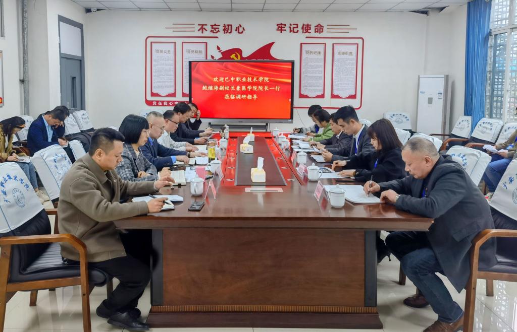3月21日下午,巴中职业技术学院副校长兼医学院院长鲍继海一行11人到医学院调研考察,并在明辉楼1-18室举行了教学工作交流座谈会。学校教务处副处长赵勇、医学院院长罗刚及医学院班子成员出席座谈会,各教研室主任及专业负责人参加座谈会,会议由医学院党总支书记喻忠主持。