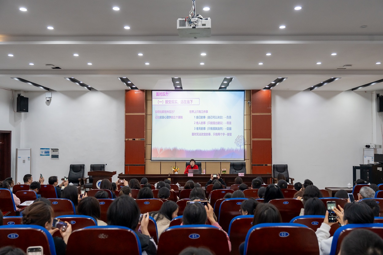 为培育教职工积极阳光、乐观自信的工作心态,调解职场及生活压力,关心关爱教职工心理健康,4月9日下午,医学院邀请经济学博士、教授,国家注册心理咨询师,原广安市副市长,原四川开放大学副校长,四川省“三八红旗手”吴兆华在先圣厅举行了“‘快乐工作、幸福生活’职场人员心理健康与压力调适”专题讲座。医学院全体教职工,校属各单位、各二级学院部分教职工,附属医院部分职工共200余人聆听了讲座,讲座由医学院院长杨书琴主持。