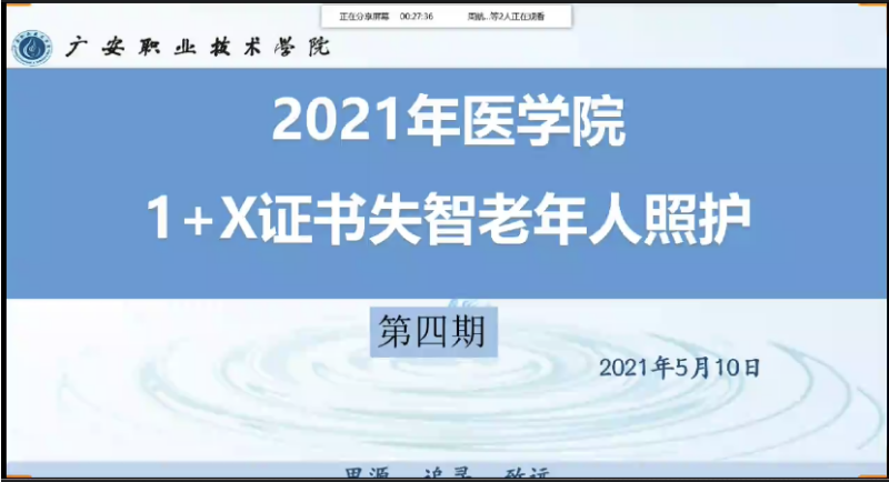 5月10日晚,医学院1+X证书失智老年人照护负责人在线上召开了失智老年人照护(第四期)培训工作推进会议。本次会议,旨在深入贯彻落实国务院办公厅及教育部、省政府有关文件精神,加快推进1+X证书失智老年人照护培训工作,会议由失智老年人照护培训师资参会。