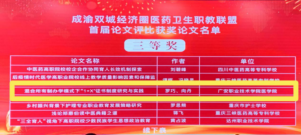 为协力培育医药创新型人才,高质量推进成渝地区医药产业发展,2021年10月14日-16日,在四川中医药高等专科学校圆满举办了成渝双城经济圈医药卫生职业教育联盟2021年学术年会,年会上开展了首届教师教学设计比赛和论文征集评比活动,医学院取得了首届论文征集评比二等奖1项、三等奖1项和首届教师教学设计大赛三等奖1项的优异成绩。