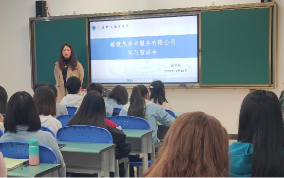 11月10日下午,椿萱茂养老服务有限公司到医学院崇贤楼B117开展实习宣讲会。宣讲会由校企合作部部长杨卉组织,老年服务与管理专业负责人王琳、部分专业教师及2018级老年服务与管理专业60名学生参会。