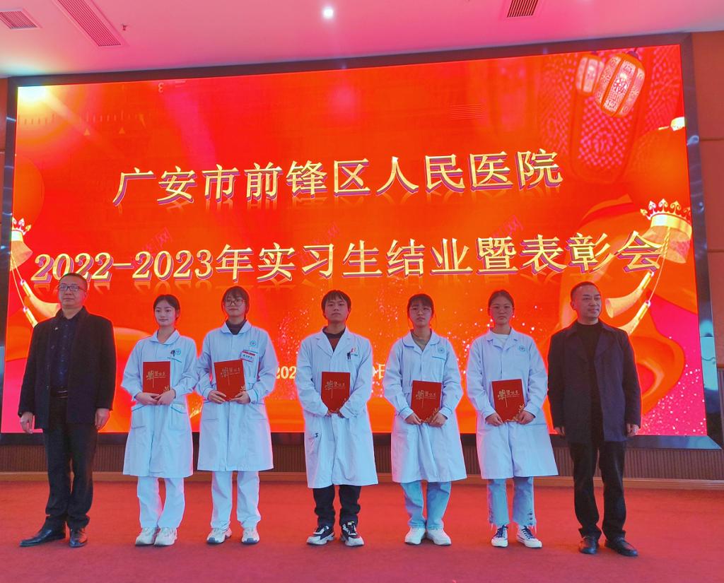 为加强医院教学管理工作,培养合格医学人才,2023年3月9日下午,前锋区人民医院举办了2022-2023年实习生结业暨表彰会,其中来自我院2020级实习生董媛媛、成丹、刘建花、刘浩、杨佳鑫5名学生获得了”优秀实习生”的荣誉称号。